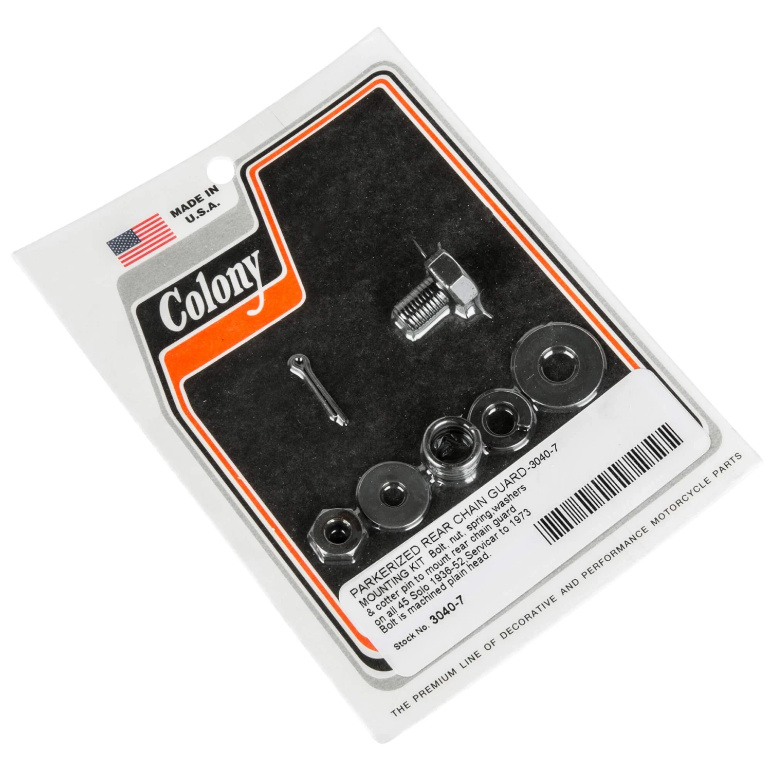 Rear Chainguard Mounting Kit Parkerized Harley 45 Solo Servicar PARKERIZED REAR CHAIN GUARD MOUNTING KIT & cotter pin to mount rear chain guard on all 45 Solo 1936-52,Servicar to 1973 Bolt is machined plain head.