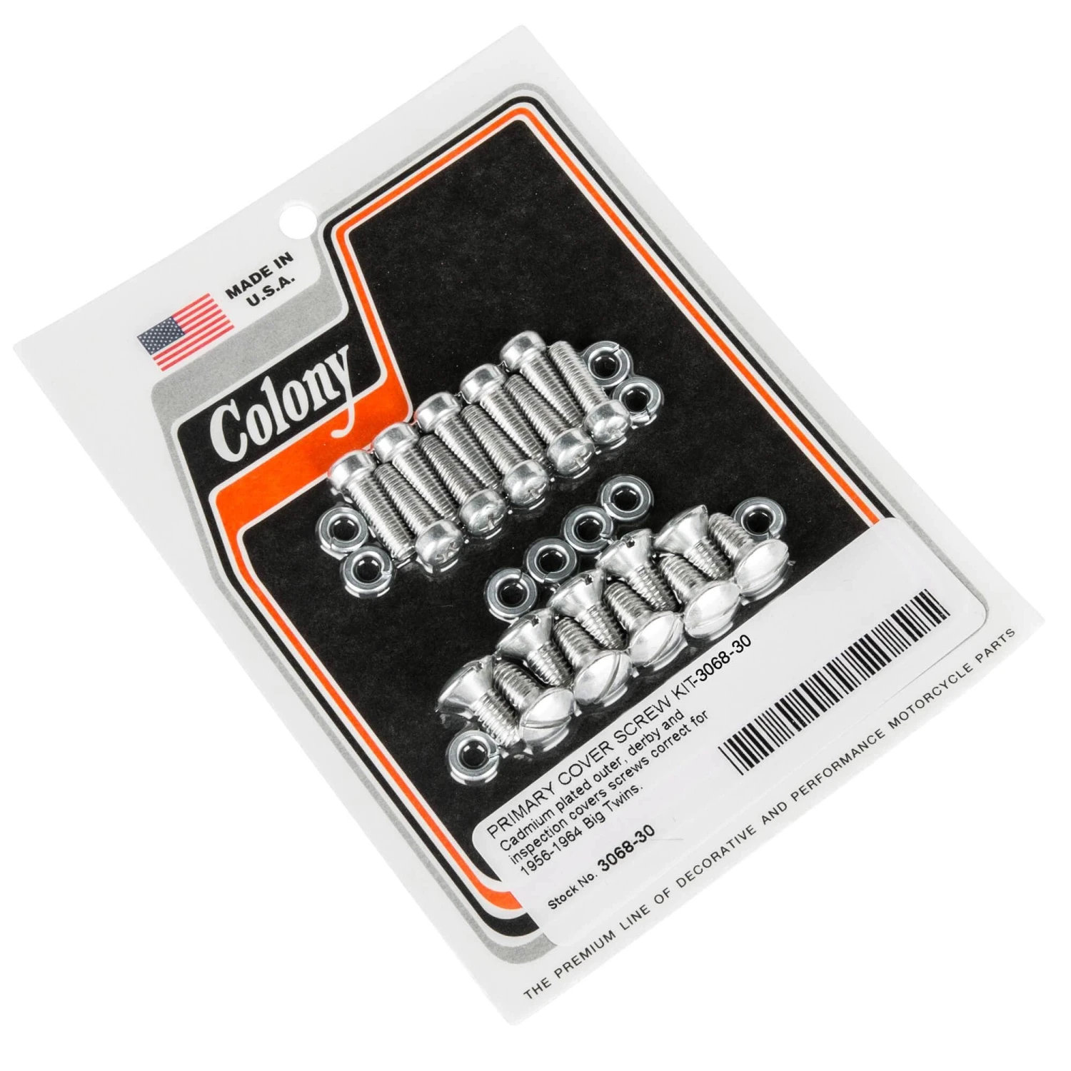 Primary Cover Screw Kit CAD Harley Big Twins 56-64 PRIMARY COVER SCREW KIT Cadmium plated outer, derby and inspection covers screws correct for 1956-1964 Big Twins.