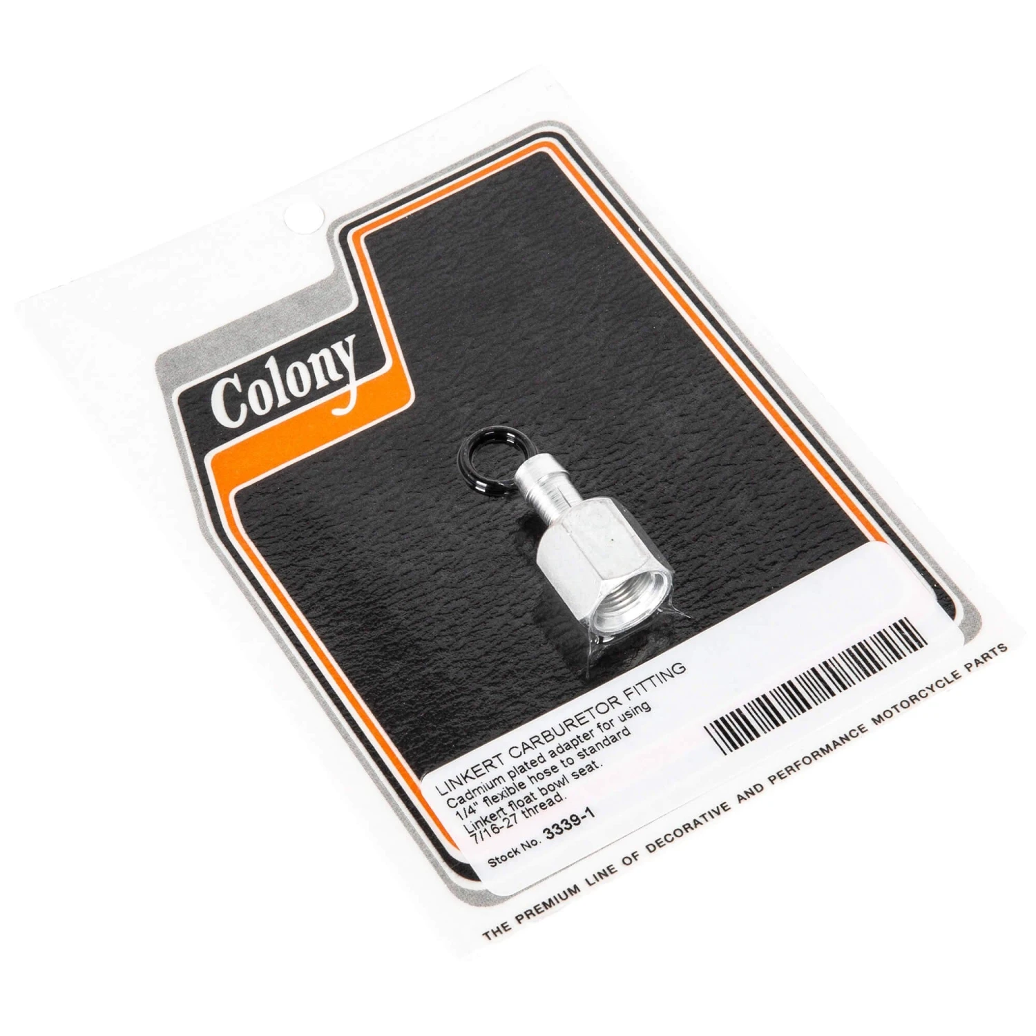 LINKERT CARBURETOR FITTING Cadmium plated adapter for using 1/4 flexible hose to standard Linkert float bowl seat. 7/16-27 thread.