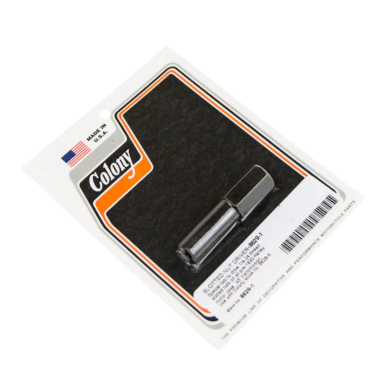 SLOTTED NUT DRIVER Special tool to drive 1/4-24 thread slotted nuts on all pre-1930 Harley motor case, ’45’ transmission. Use with Colony stock no. 8628-6.