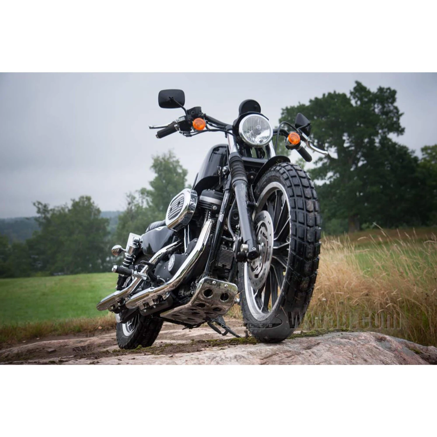 sizes that can be freely combined. Perfect for those late model Harley riders who get the urge to find some off road adventure. The tires are certified by German TÜV for speeds up to 190 kph so your ride is well shod if the next ride turns out to get dirty or Autobahn fast, no matter what. DOT approved, E4 approved, Germany.