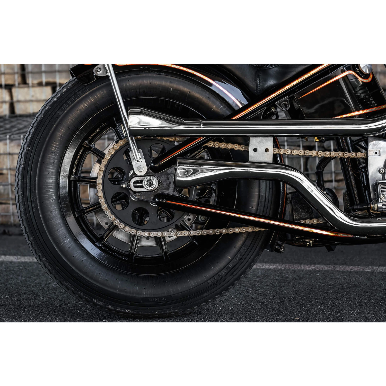 NOTES: These are made for use in a stock Sportster frame or a frame or hardtail which uses stock spacing (such as hardtails which use the stock rear wheel assembly, brake, and axle spacers). If the frame you are using is a different axle plate spacing (width) or you are using a non-stock wheel this may affect the rear sprocket alignment. This is for use with a stock width wheel, and is not for a wide tire conversion. Because of tight clearance when using stock muffler mount or stock passenger peg mounts do not use an O-ring chain because the additional width may cause chain to wear at these components on deceleration.
