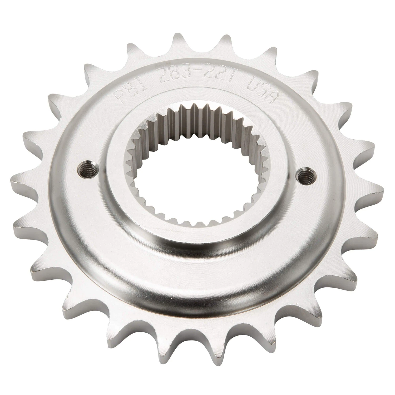 This kit is designed to match stock gearing for 1995-2003 883 Sportsters. The countershaft (front) sprocket is 22 teeth, and the rear sprocket is 48 teeth, for a 2.18:1 gearing ratio. This means that the countershaft sprocket rotates 2.18 times to spin the rear sprocket one full revolution. The less times the countershaft sprocket has to rotate, the taller the gearing, meaning less power off the line but better high-speed cruising. The 1995-1999 rear sprocket has a 1.985 inch diameter center hole and the 2000-2003 rear sprocket has a 2.214 inch diameter hole to properly fit the stock 1200 Sportster rear wheel.