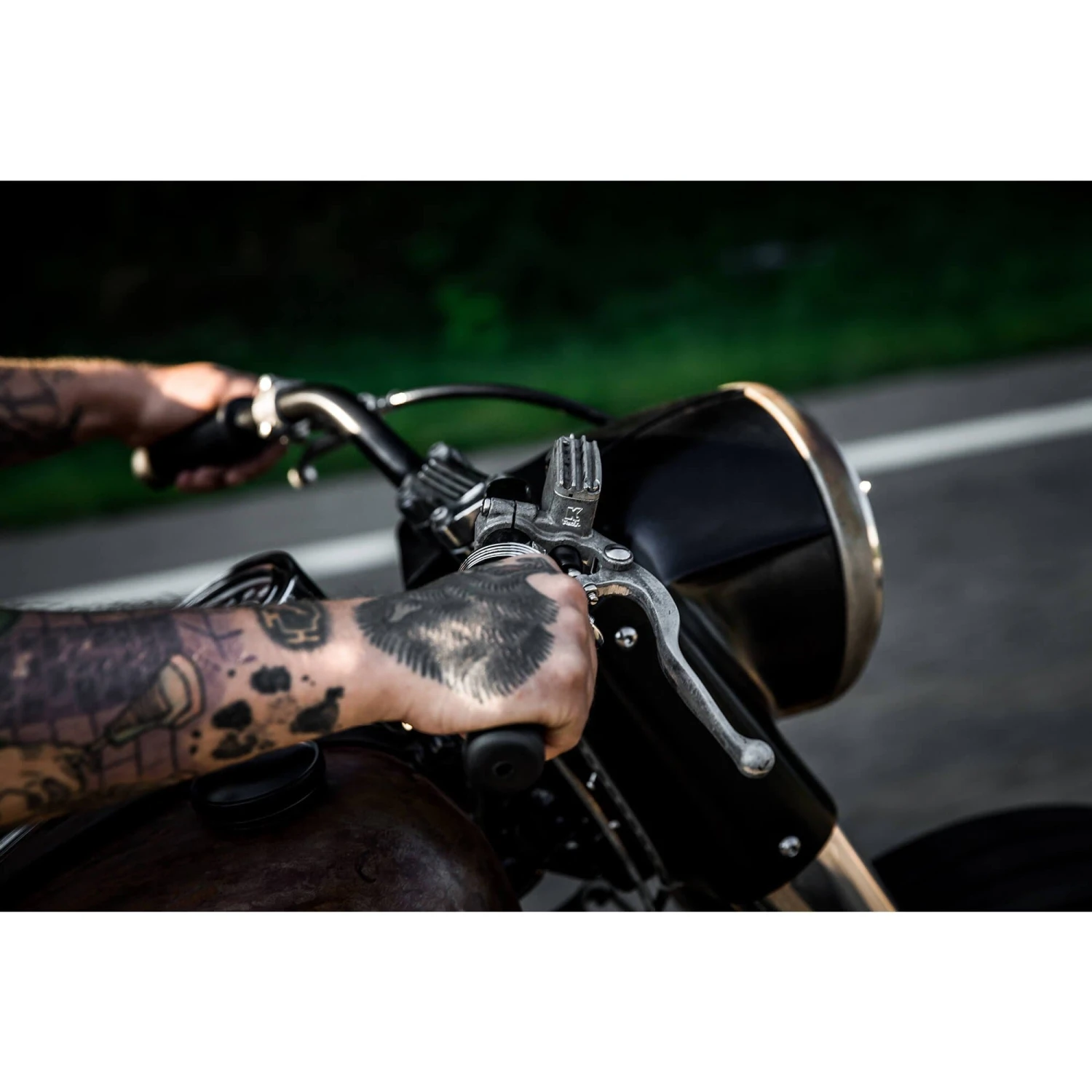 Made from forged aluminum body, the Classic line master cylinder by KustomTech in Italy comes in a raw aluminum body, lever and finned cover held in place with two screws. The compact size with finned cover and the smooth lever will give a very retro-style look for all custom projects. It fits all 1″ handlebars and has a 14 mm bore size. For use with DOT 4 or DOT 5 brake fluid. The included banjo bolt is 10mm x 1.00.