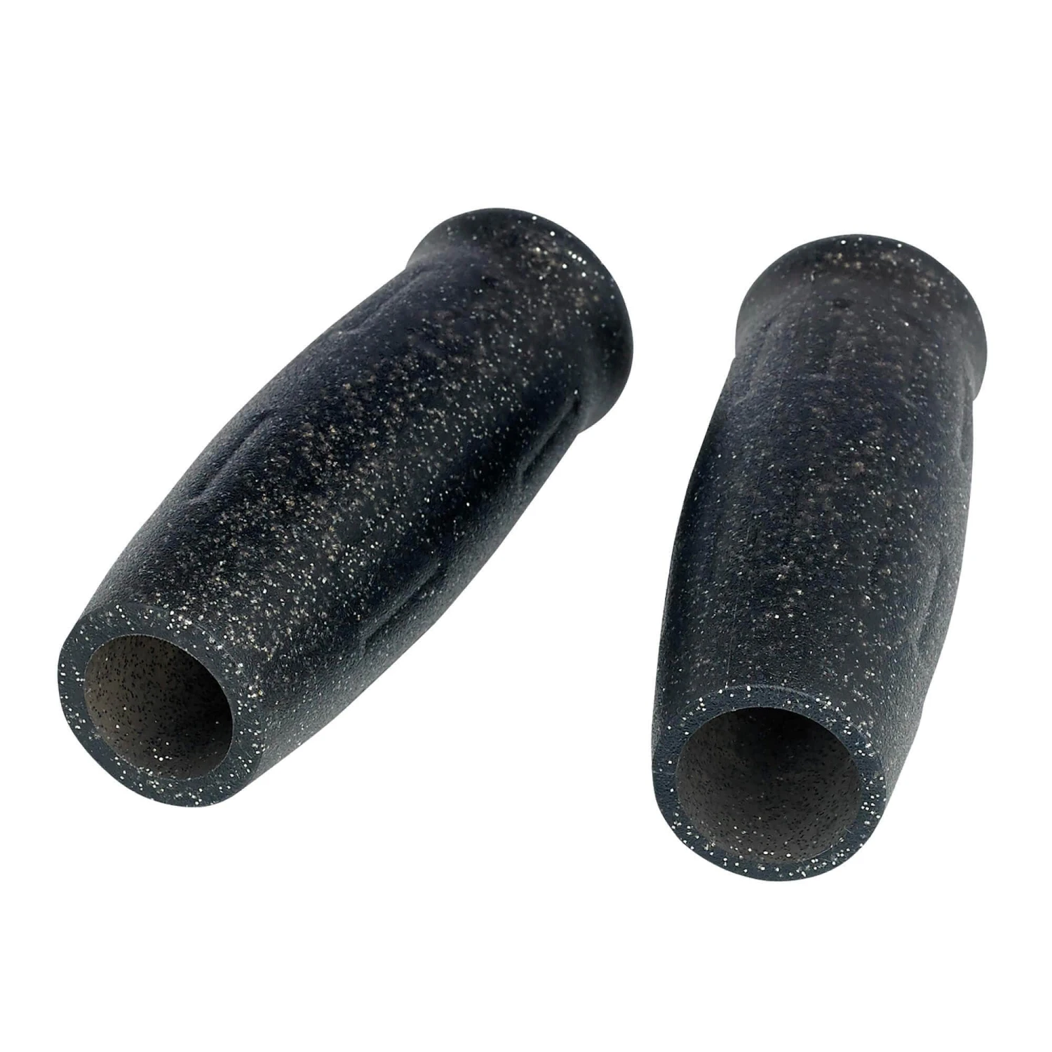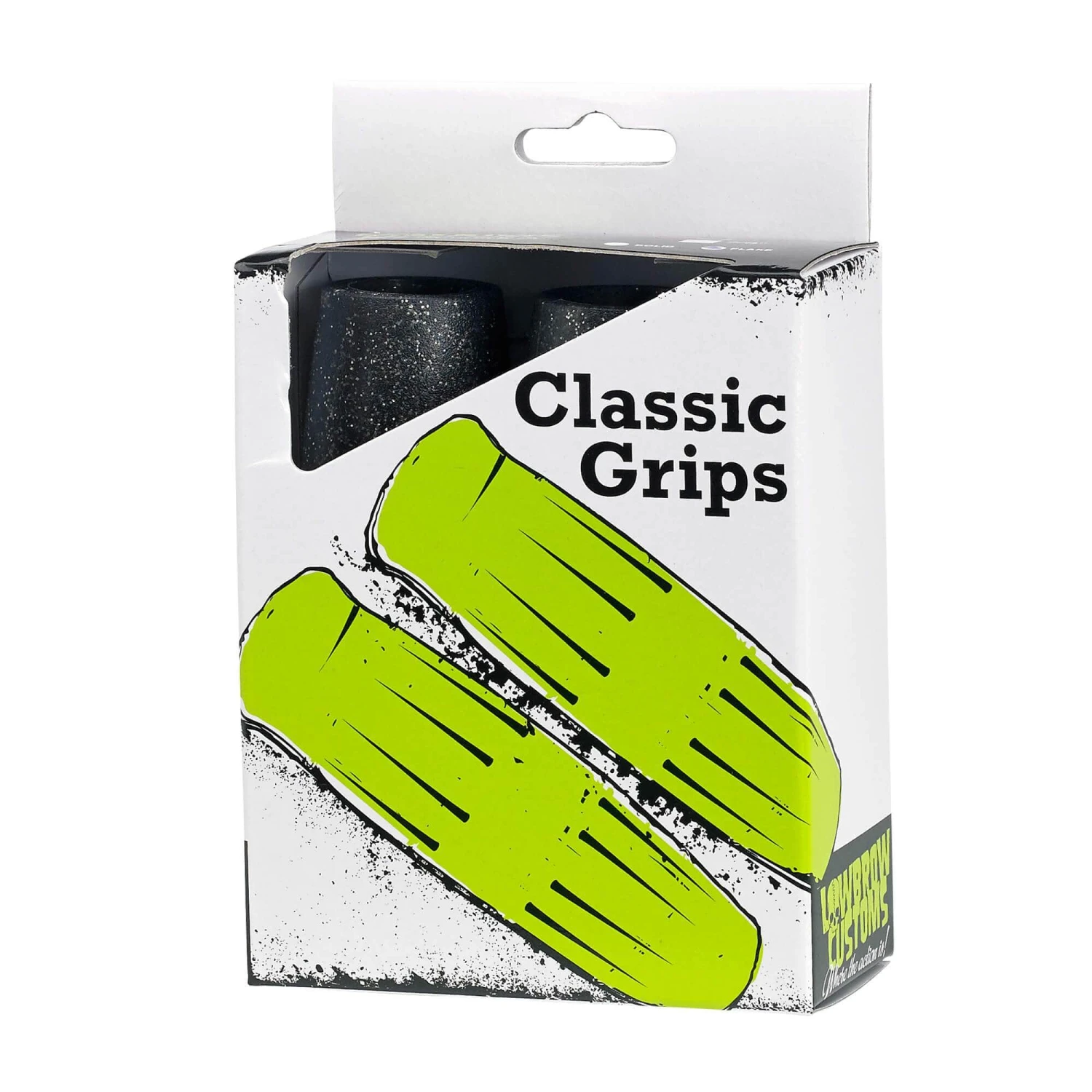 Metalflake Black, for 1 inch handlebars. As the name implies, Classic Grips from Lowbrow Customs are a timeless design that look at home on vintage and modern motorcycles alike, be it a chopper, bobber, cafe racer or any other fringe of the motorcycle scene. Styled after vintage Harley-Davidson coke bottle grips that were made for stock internal throttles but updated to fit modern motorcycles. This comfortable, radiused grip made out of Krayton rubber is available in several popular colors and is sold per pair. It is important to choose the proper size grips for your motorcycle. Grips are available in 1 inch (the size needed for all Harley-Davidsons and other ‘cruiser’ style motorcycles) as well as 7/8 inch (common on many vintage British, European and Japanese motorcycles such as Triumph, Honda and Yamaha). Please note that any pair of motorcycle grips has two different inside diameters. The grip for the left side (as if you were sitting on the bike) of the handlebar has a smaller diameter, and the right side grip has a larger inside diameter to fit over your throttle tube. Grips are manufactured to have a tight fit, you don’t want one sliding off while taking a corner or twisting the throttle! They are easy to install using a bit of WD-40 to help get them in place. Alternatively, you can use compressed air as seen in our