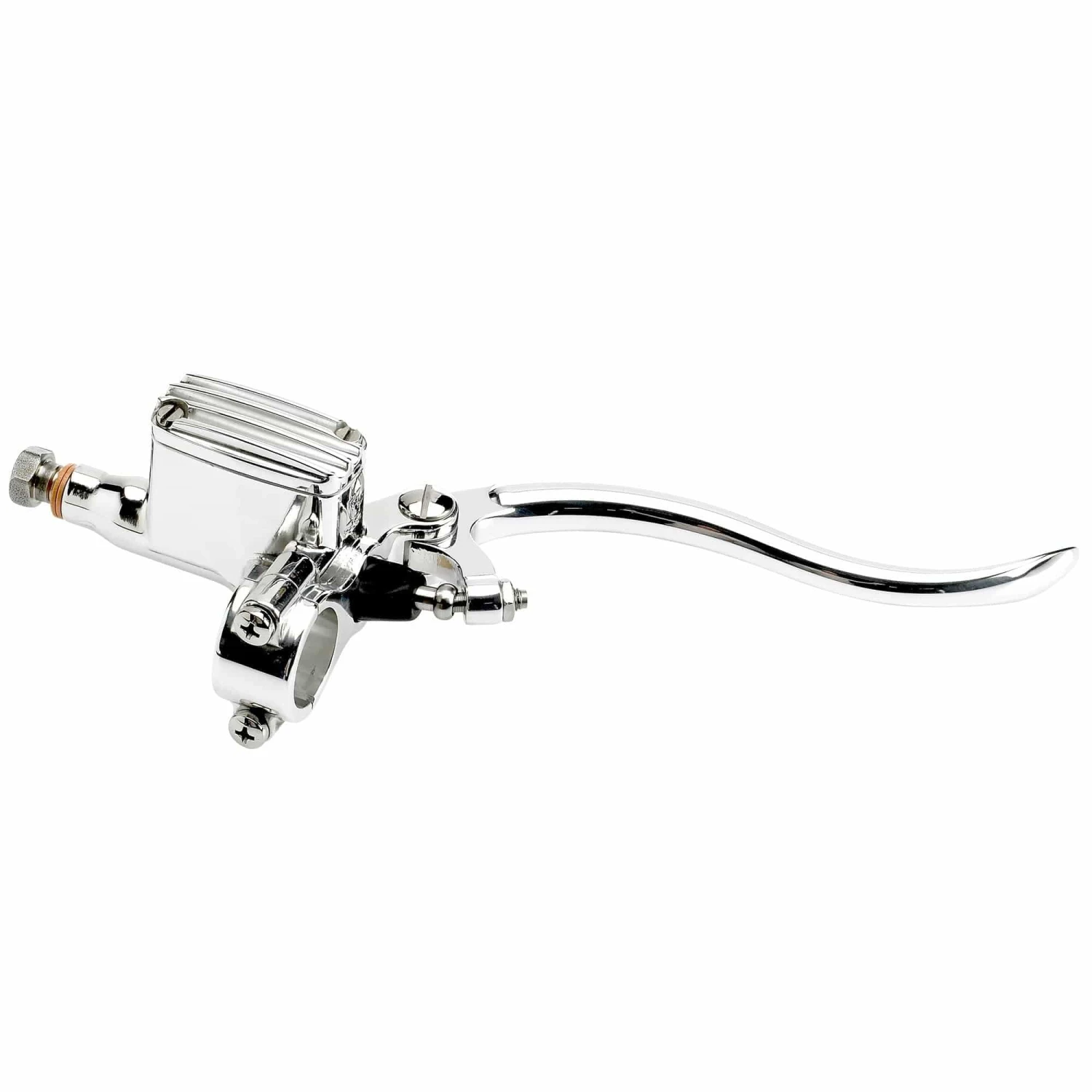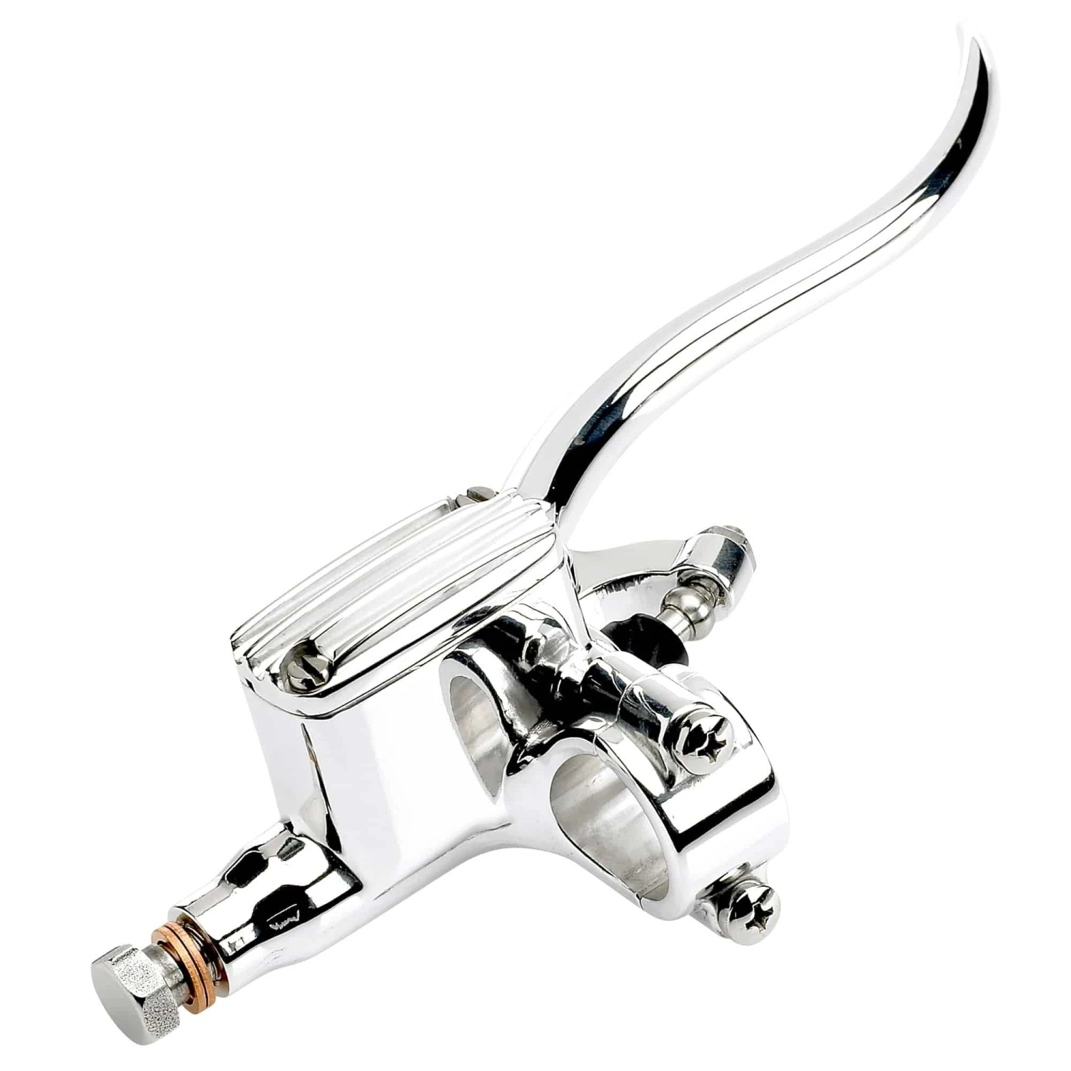 Made from forged aluminum body, the DeLuxe line master cylinder by KustomTech in Italy comes in fully polished aluminum body, lever and finned cover. The compact size with finned cover and the smooth lever will give a very retro-style look for all custom projects. It fits all 1″ handlebars and has a 14 mm bore size. For use with DOT 4 or DOT 5 brake fluid. The included banjo bolt is 10mm x 1.00.