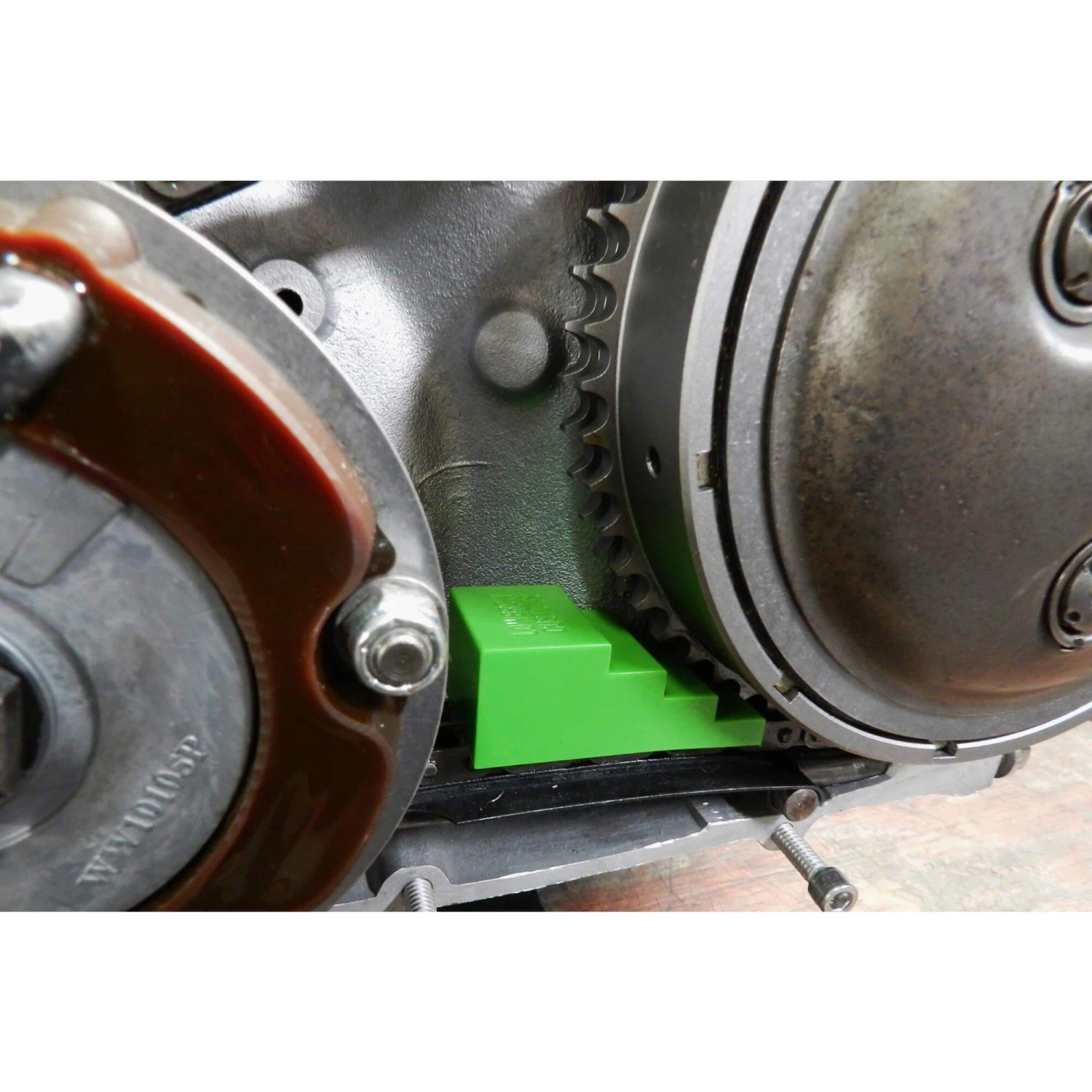 If you are working on the primary or clutch on your Harley-Davidson, Triumph, BSA, Norton, Honda, Yamaha or anything else, this tool will save you a lot of headaches! This grade 95A, high tensile polyurethane locking block can be inserted between your chain and sprocket or clutch basket, locking it in place while you install or remove primary or clutch components.