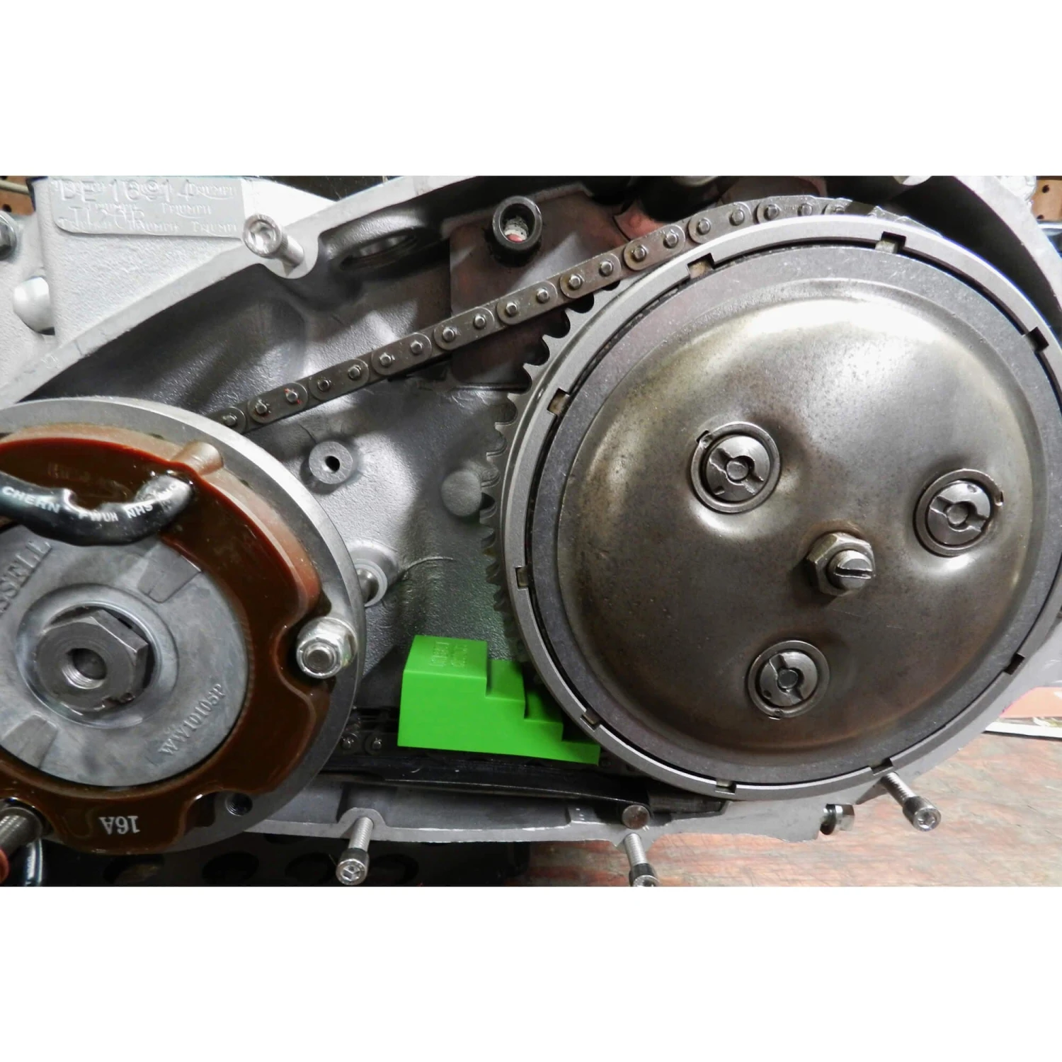 This material is tough enough to take the pressure and stop your primary from turning while you torque hardware in place, but soft enough to not damage your chain, sprocket or pulley. Works well with chains as well as belt drive systems. The bright green helps ensure that you don’t leave it in your primary before you install your primary cover and hit the road! Made in the USA.
