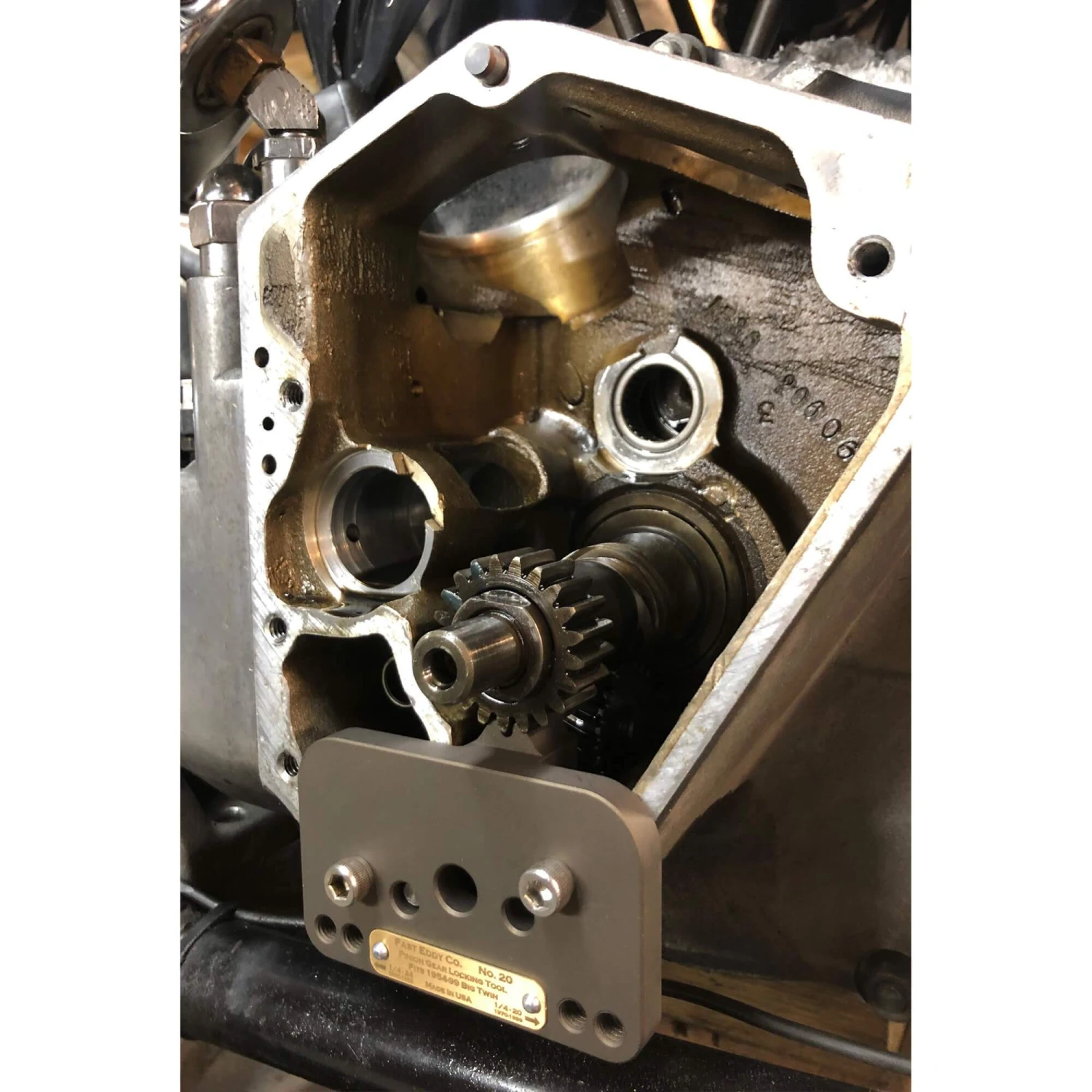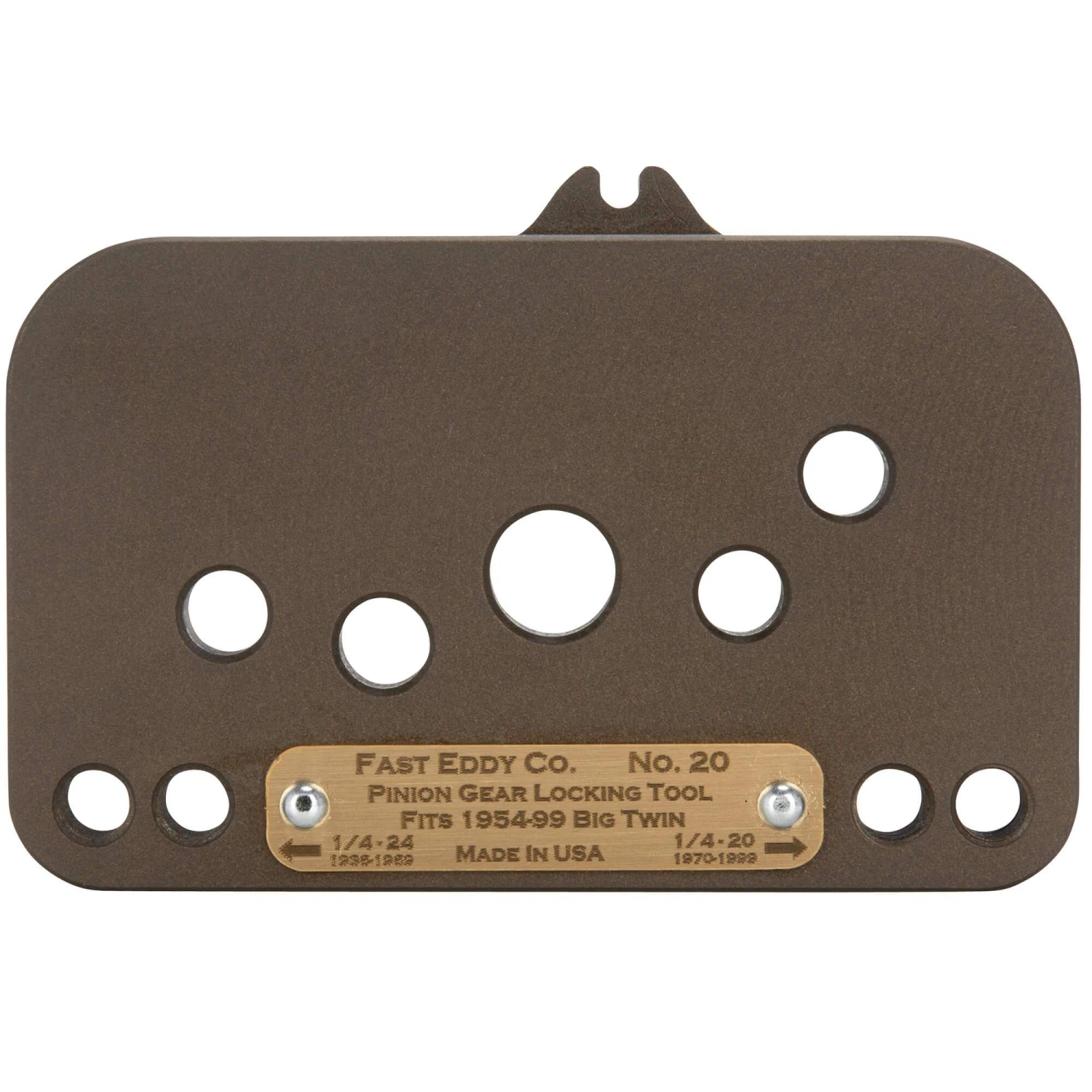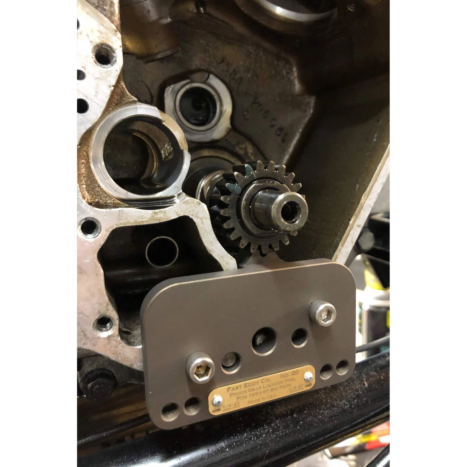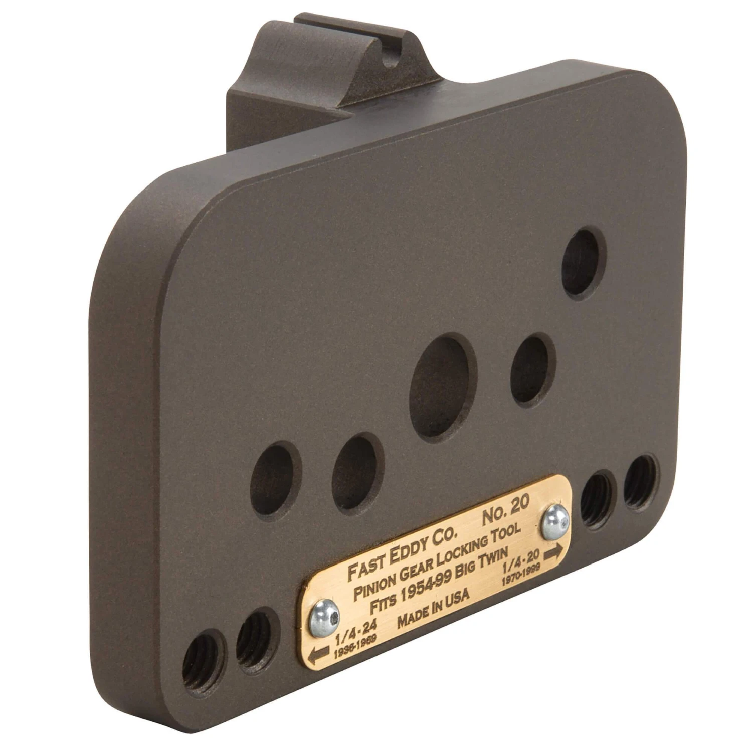 This tool locks your pinion gear in place so you can hold pinion nut properly. It is made out of tool steel and is heat treated to last several lifetimes. Fits all 1954-99 Harley Big Twins. Makes it much easier to tighten the pinion nut, and enables you to apply an accurate, factory-specified torque. Includes tapped holes to store the 1/4-20 and 1/4-24 screws that you use to mount the tool. To make life easy Fast Eddy Co. also has a