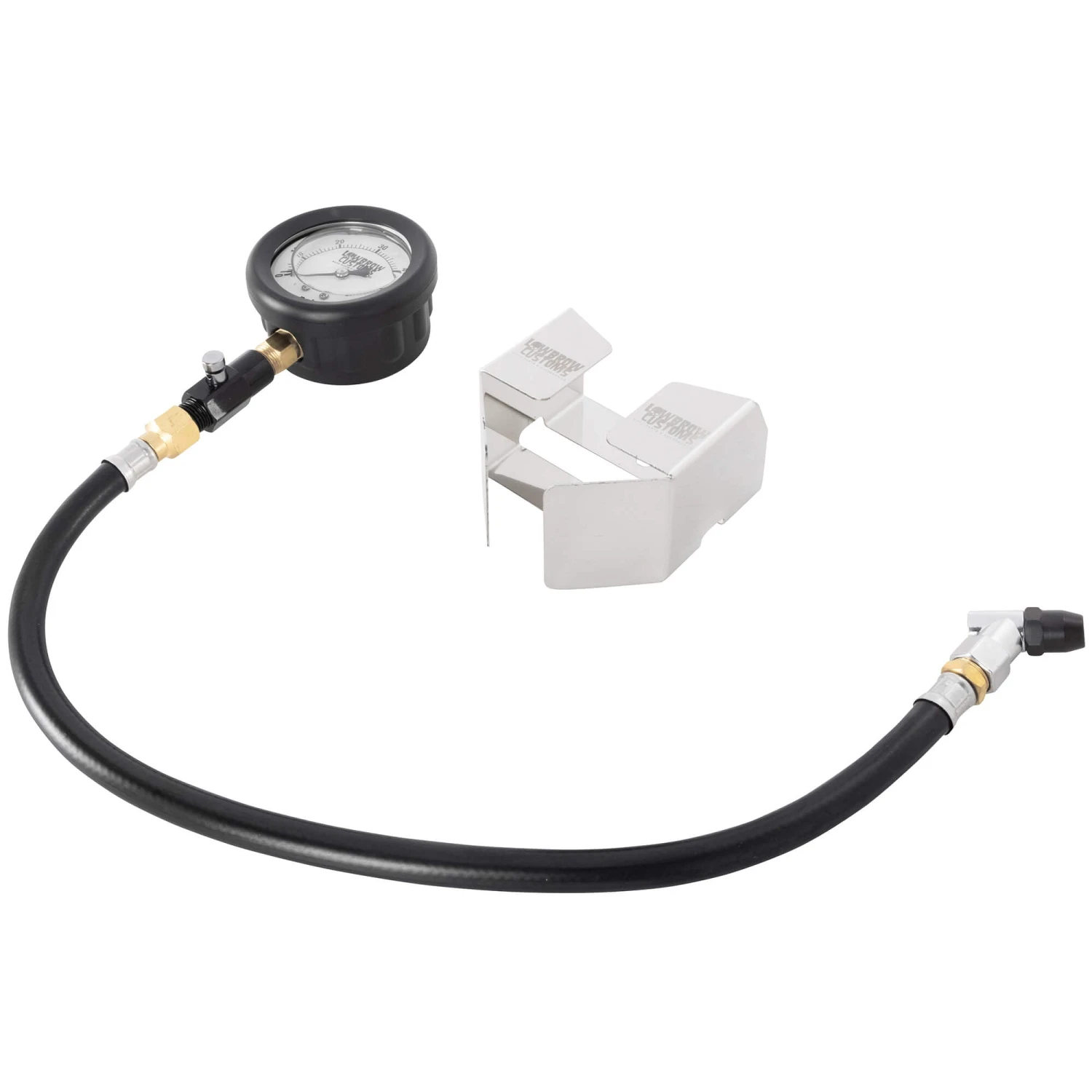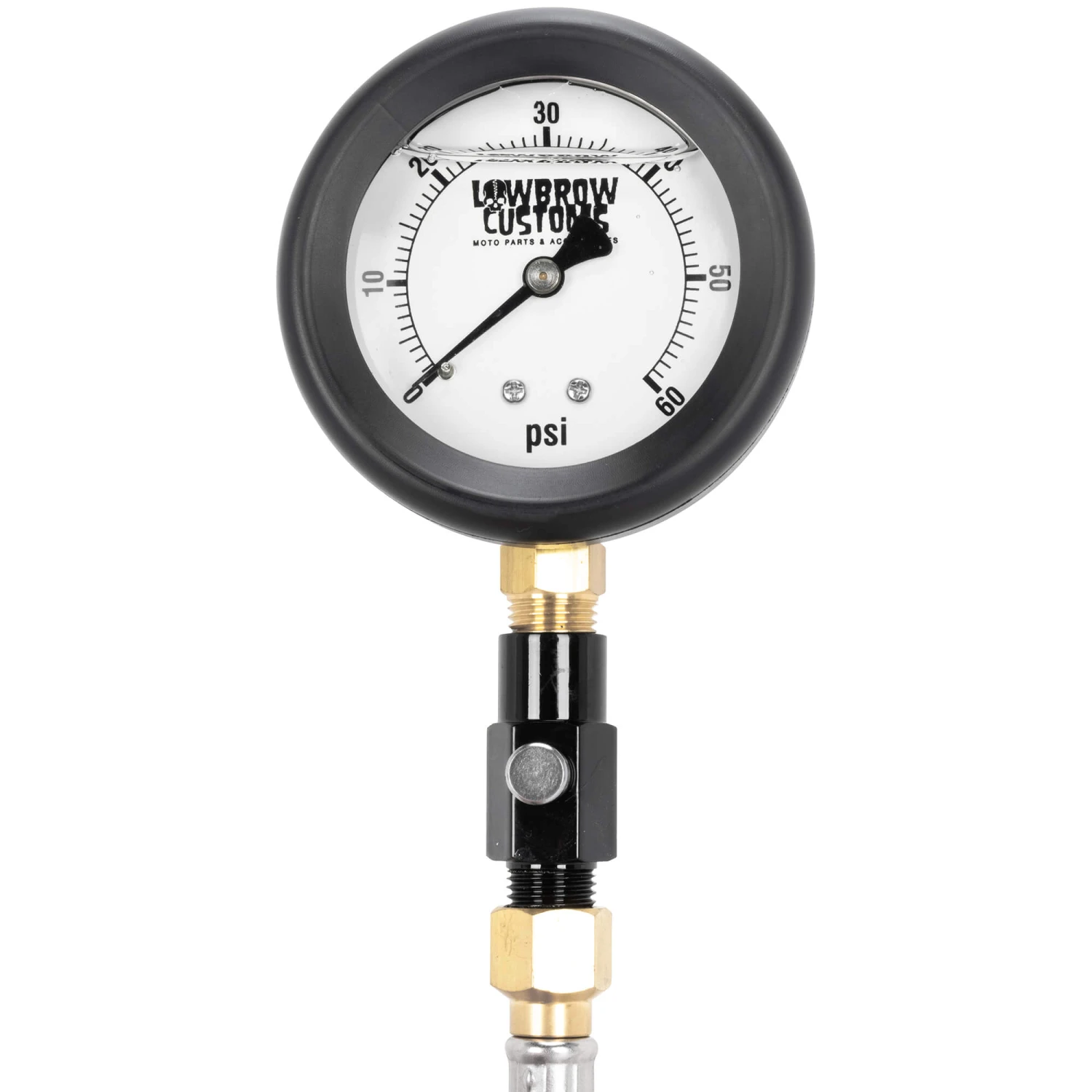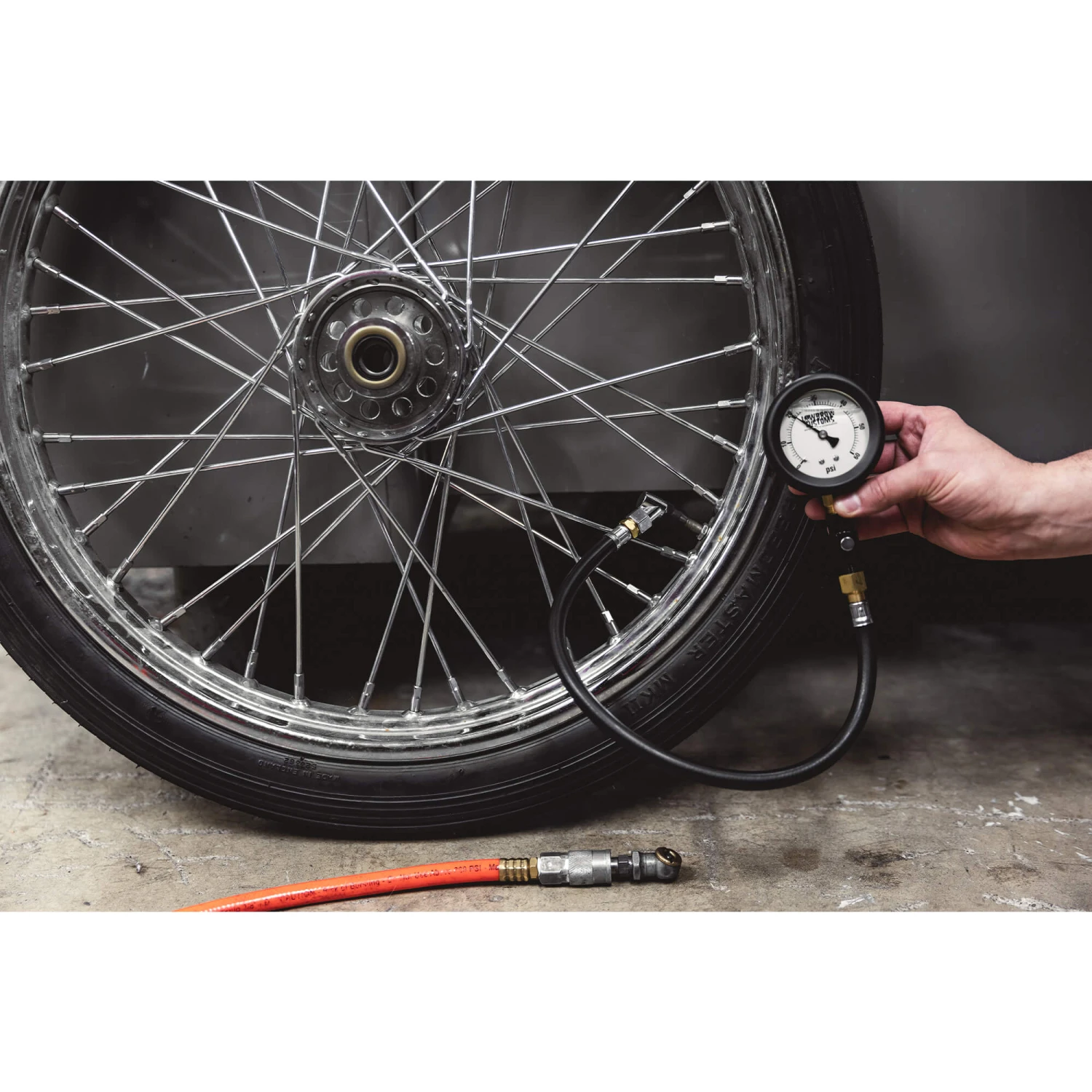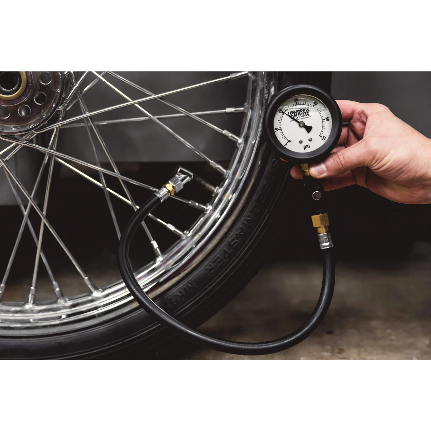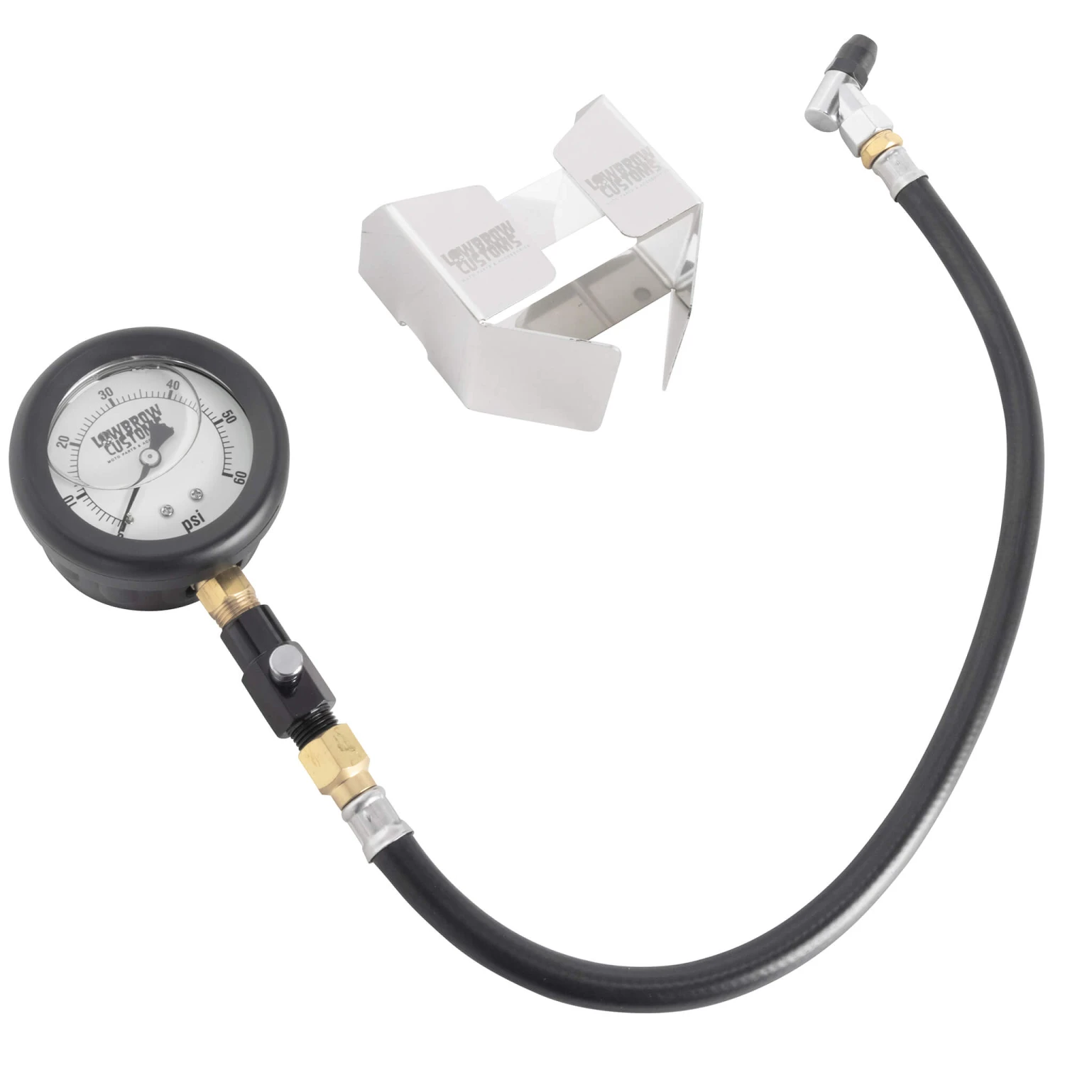 Our Lowbrow Customs Professional 0-60 PSI Tire Gauge is accurate and built to last. This tire gauge has a 2.5” glow-in-the-dark dial that is liquid filled to help support accurate readings. The 17” heavy-duty hose is long enough to reach your tire stem, and the rubber casing protects the steel body from shock. 45° swivel angle chuck ensures easy use and the pressure release valve makes adjustments quick and easy. This is not a cheap gauge. This is a high-quality tool that you will simply love. Comes with a Lowbrow Customs dial and a stainless-steel holder for easy storage.