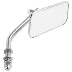 Need that mirror to stay legal, or clear up a fix-it ticket from the man? No billet, skulls, or LEDs here! This is a classic, compact square motorcycle mirror can be adjusted and mounted on either left or right hand side. The stem is 4″ long with 8mm x 1.0 threads, the mirror is a tidy 4-1/2 inches by 2-1/4 inches, and the whole assembly is chromed steel. Perch mount mirrors install in the mirror hole found on most hand controls, or can be used with a